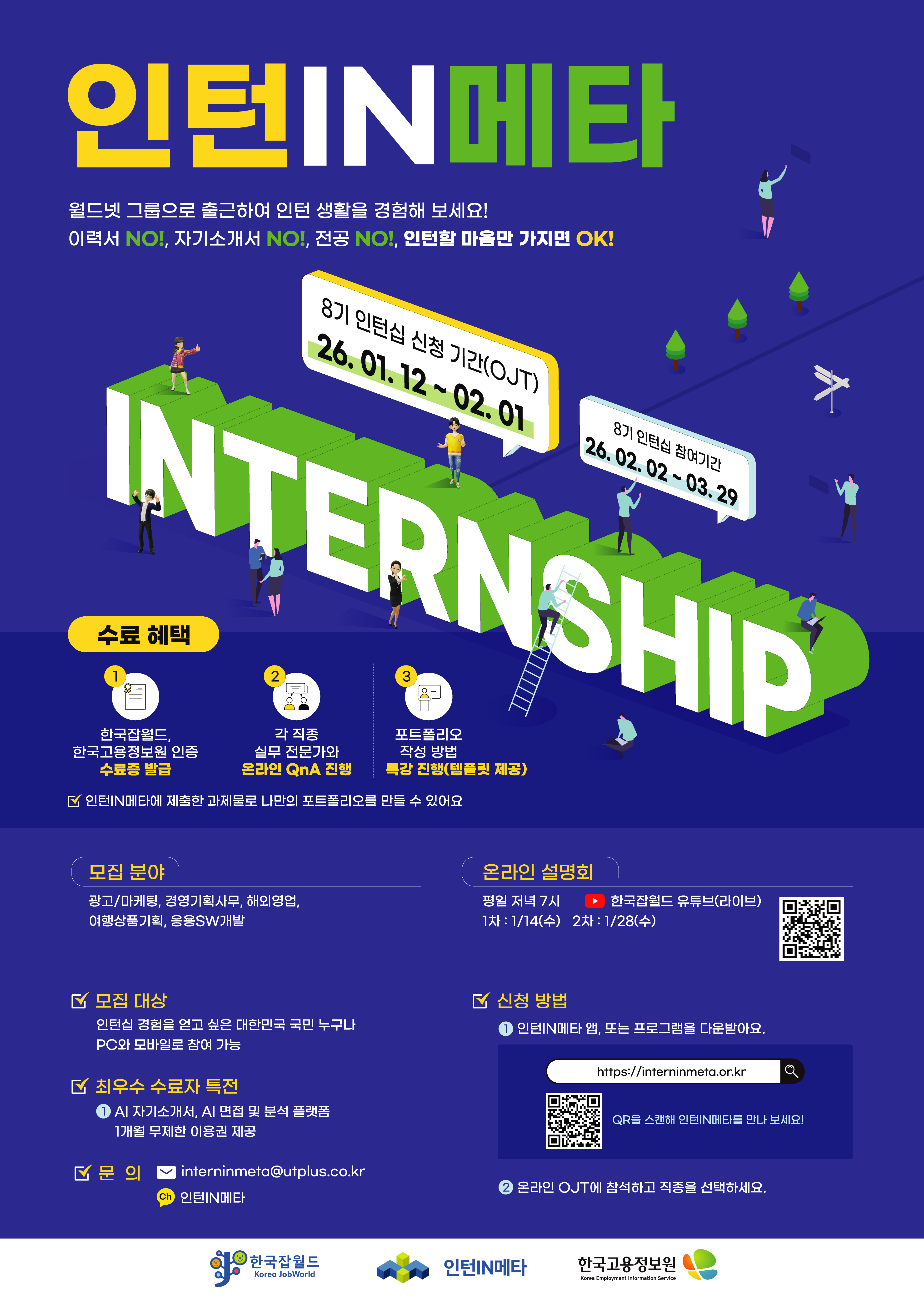 인턴 경험을 얻고 싶은 대한민국 국민 누구나 PC와 모바일로 참여 가능 주당 15시간, 8주간 총 120시간 근무 경영기획사무, 광고홍보마케팅, 해외영업, 응용SW개발, 여행상품개발 5개의 회사에서 인턴을 모집합니다.